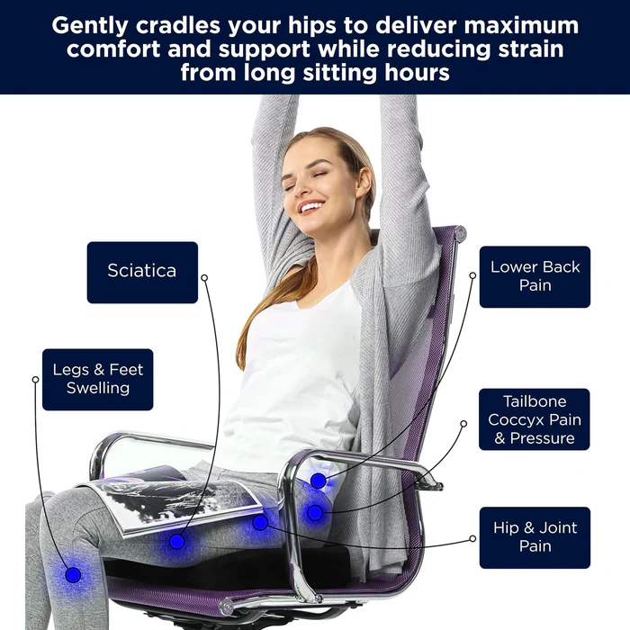 - RELIEVES TAILBONE AND BACK PAIN- The unique cut-out of the cushion minimizes the pressure on the tailbone and allows it to suspend naturally, thereby, reducing the pain.