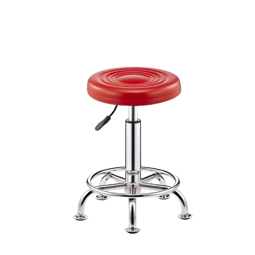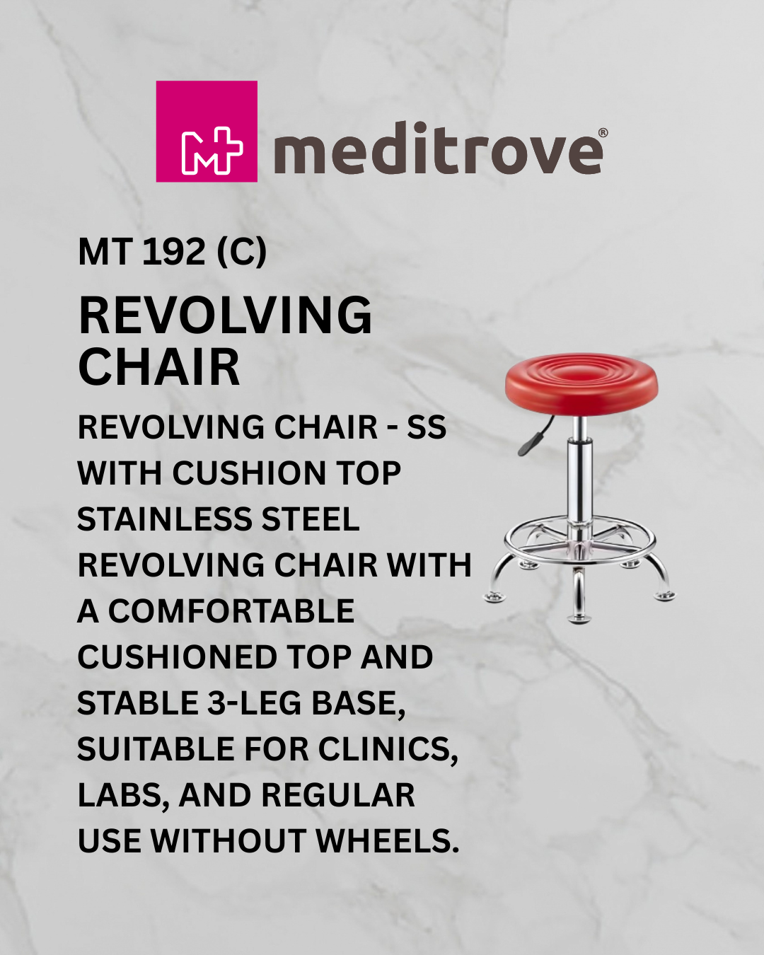 REVOLVING CHAIR – SS WITH CUSHION TOP STAINLESS STEEL REVOLVING CHAIR WITH A COMFORTABLE CUSHIONED TOP AND STABLE 3-LEG BASE, SUITABLE FOR CLINICS, LABS, AND REGULAR USE WITHOUT WHEELS.