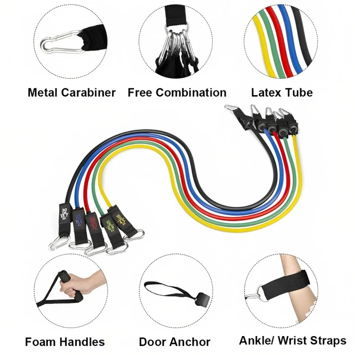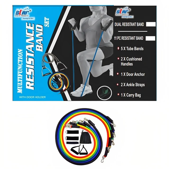 This 11-Piece Resistance Band Set is a complete and versatile home workout kit designed for strength training, toning, flexibility, and rehabilitation exercises. Suitable for beginners as well as advanced users, it allows you to perform full-body workouts anytime and anywhere.